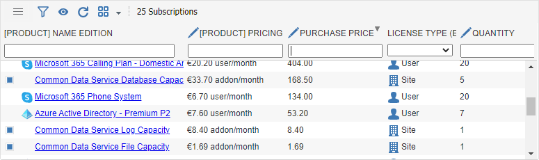 Example 2: A report about current Microsoft subscriptions includes menu items to carry out actions on the Microsoft 365 agreement, the individual licenses and the products that the licenses are associated with.